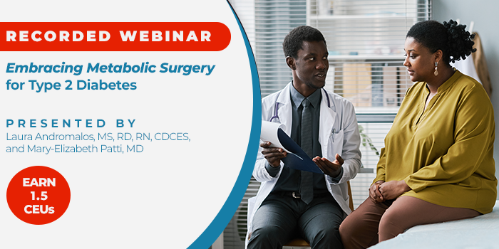 Join Laura Andromalos, MS, RD, RN, CDCES, and Mary Elizabeth Patti, MD, for a webinar that emphasizes the importance of collaboration across health care team members and specialties to support patients in pursuing MBS when clinically warranted. Participants will learn about the pathophysiology of diabetes improvement following MBS and when and how to refer patients for surgical assessment. Leave with practical applications for managing the health of patients with diabetes before and after MBS to optimize outcomes and assist in achieving health goals.